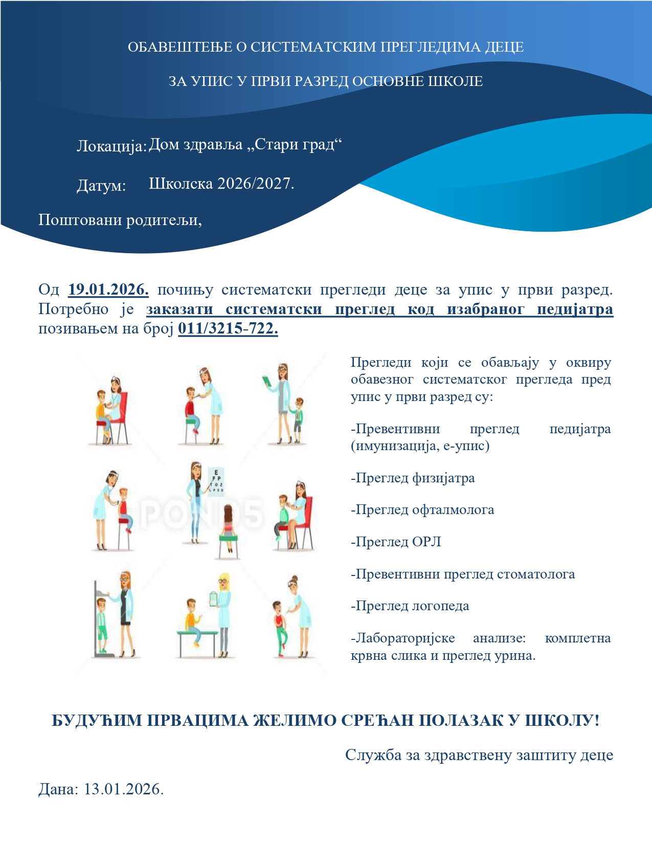 ОБАВЕШТЕЊЕ О СИСТЕМАТСКИМ ПРЕГЛЕДИМА ДЕЦЕ ЗА УПИС У ПРВИ РАЗРЕД ОСНОВНЕ ШКОЛЕ
