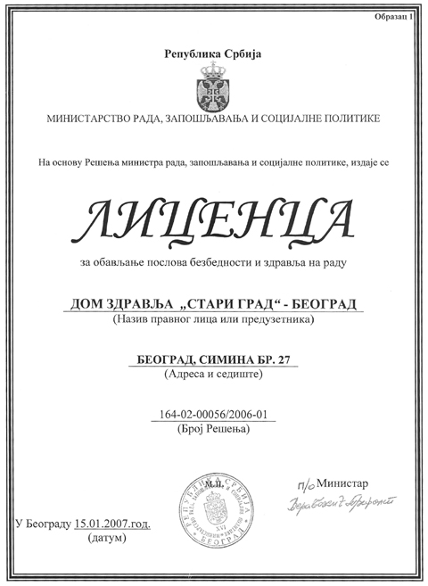 Дом здравља Стари град поседује лиценцу за обављање послова безбедности и здравља на раду.